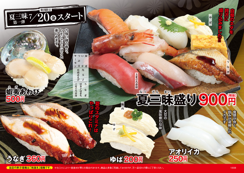 2018/7/20 夏三昧フェア第一弾 by admin_ahy36cvp · 公開 2018年7月20日 · 更新済み 2018年8月9日 7月20日(金)スタート 自慢のネタを贅沢に盛り込みました ☆夏三昧盛り 900円(税抜) 夏のスタミナはやっぱりこれ ☆うなぎ 360円(税抜) 食感が良く旨みが凝縮 ☆アオリイカ 250円(税抜) 大豆の風味豊かな味 ☆ゆば 200円(税抜) 力強い磯の香りレモンでさっぱりと楽しめます ☆蝦夷(えぞ)あわび 500円(税抜)